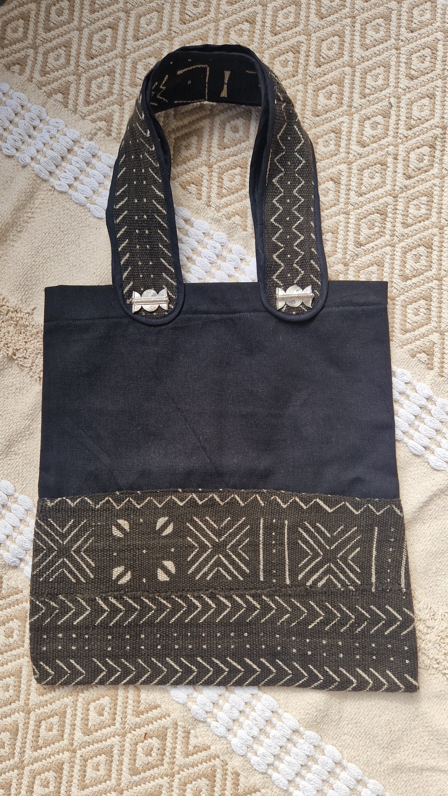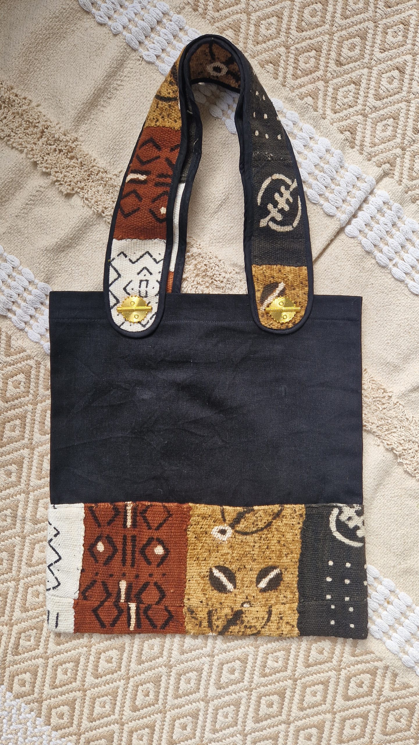 Totebag en authentique Bogolan du Mali, étoffe filée et tissée à la main, et décoré de bijoux en Poids Baoulé de Côte d’Ivoire.