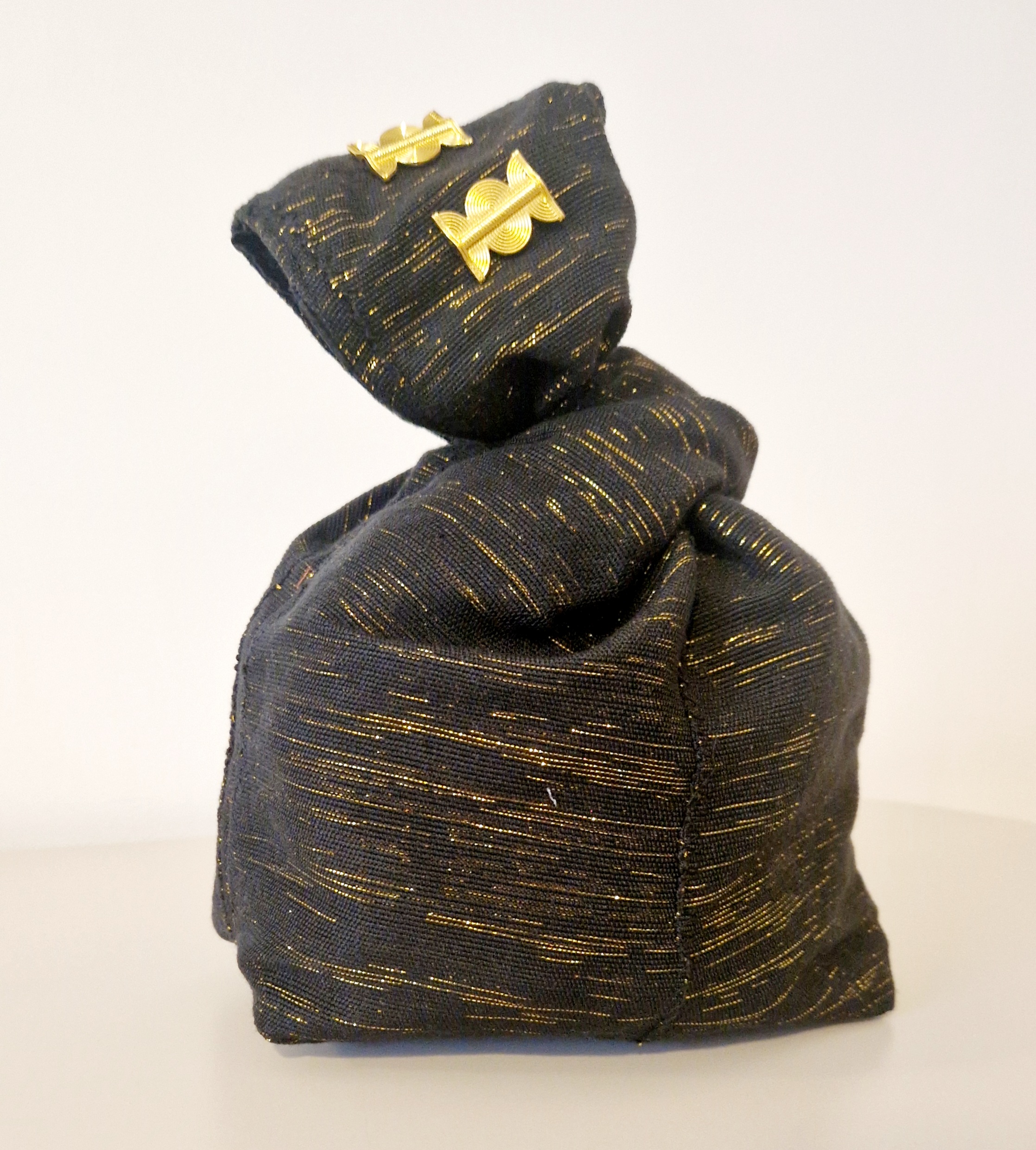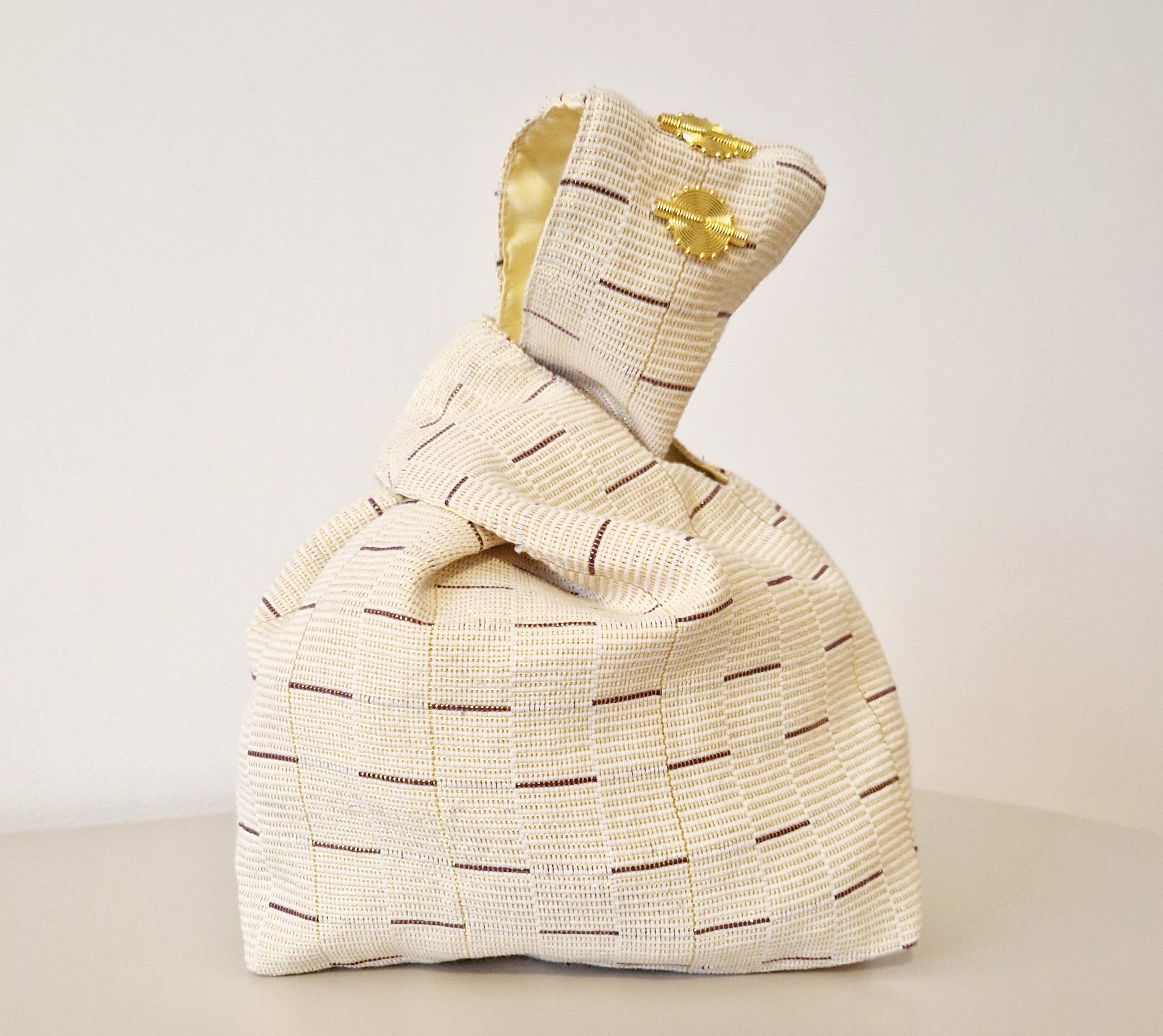 Inspiré du Knot bag traditionnel japonais, ce petit sac en véritable Kenté brillant a une coupe asymétrique avec une anse plus longue que l’autre, permettant une fermeture naturelle sécurisée. Tissé et filé à la main par des artisans du Ghana, il est agrémenté de fils dorés ou argentés et décoré de poids Baoulé de Côte d’Ivoire . Il se porte à la main ou au poignet et est parfait pour y glisser vos essentiels.